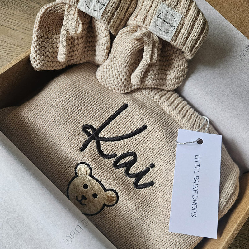 Introducing our Beige Romper & Bootie announcement set, beautifully crafted from the softest 100% cotton. The set shares the much loved quality of our hugely popular cotton knit blanket collection, inviting a perfect match for cosy comfort and neutral aesthetics.