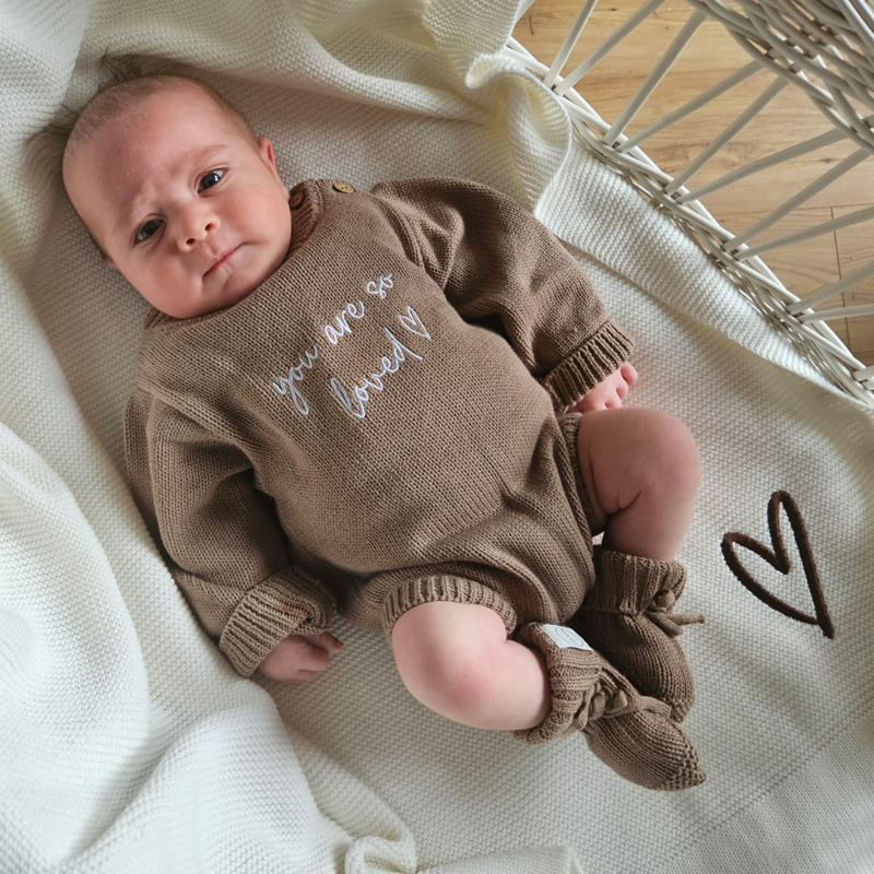 Baby wearing taupe announcement personalised knit romper with embroidered message, styled on a soft neutral blanket with matching bootie