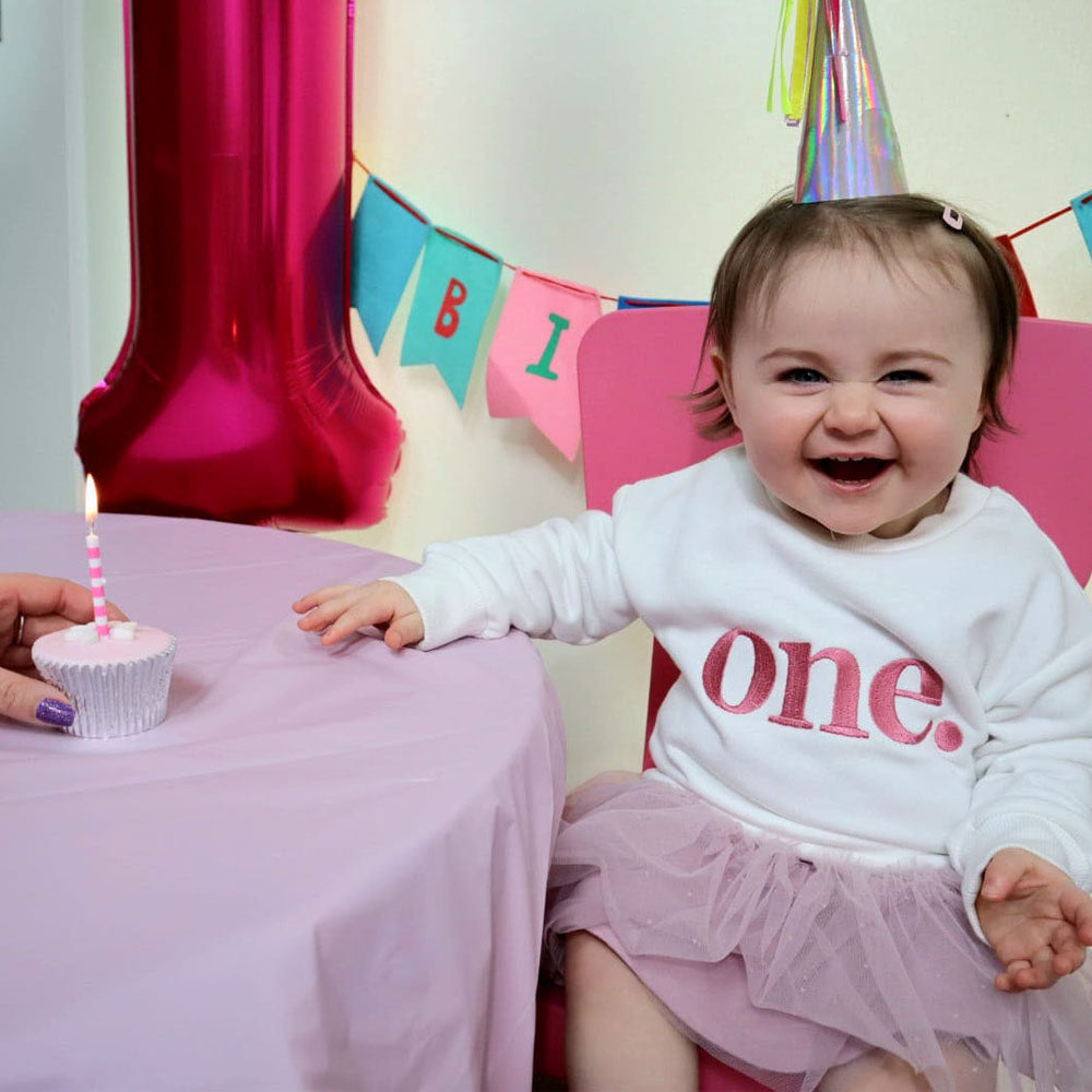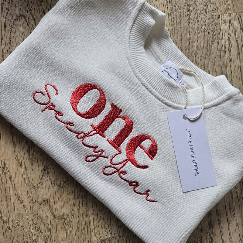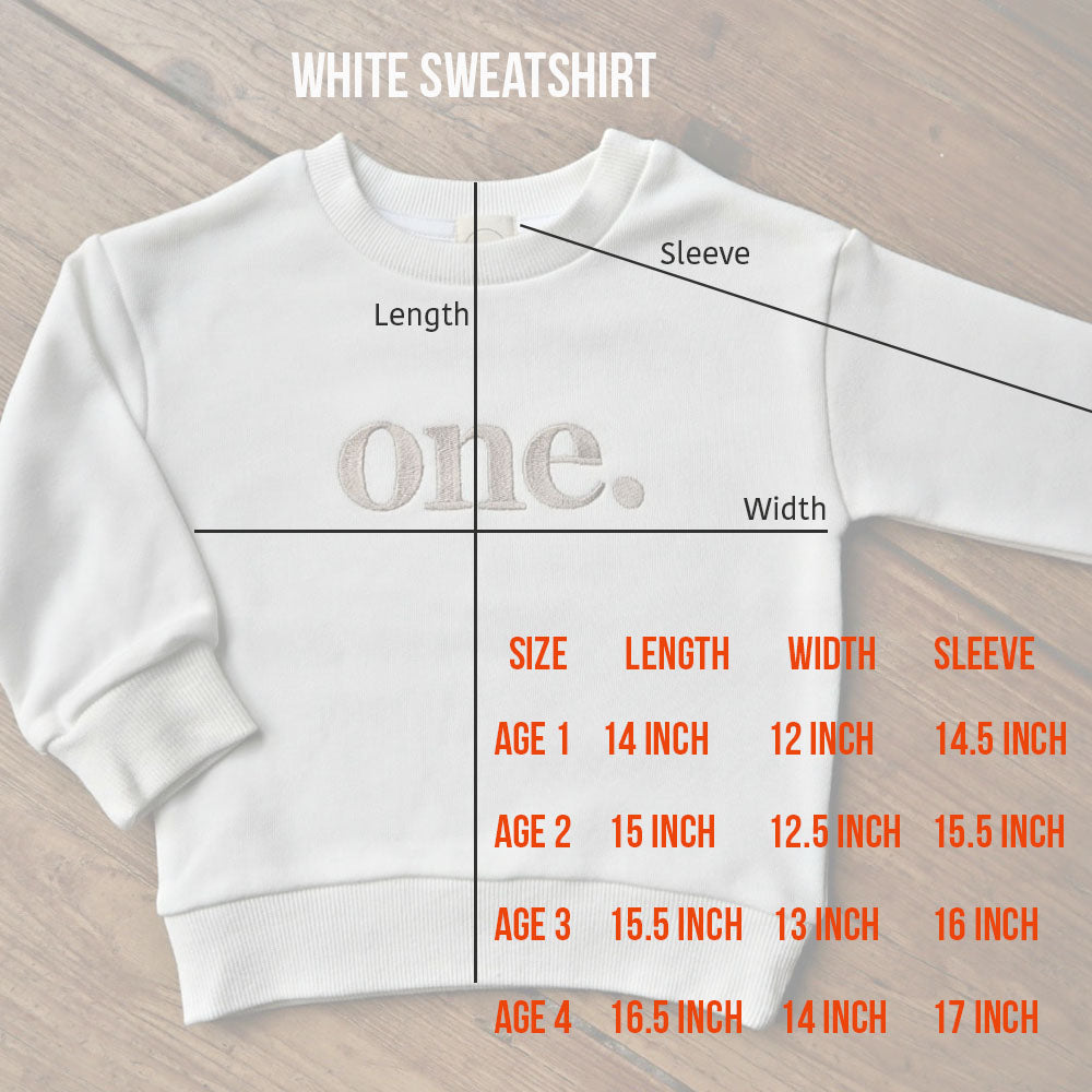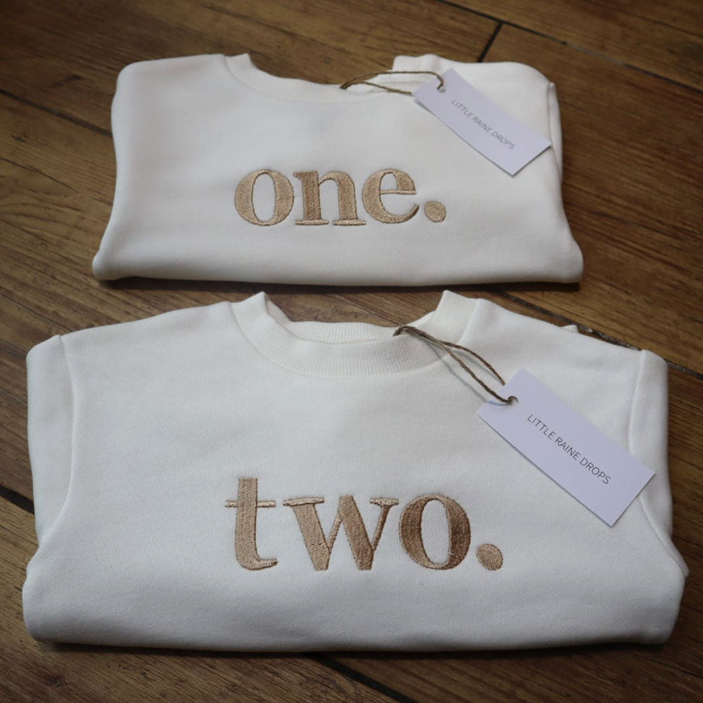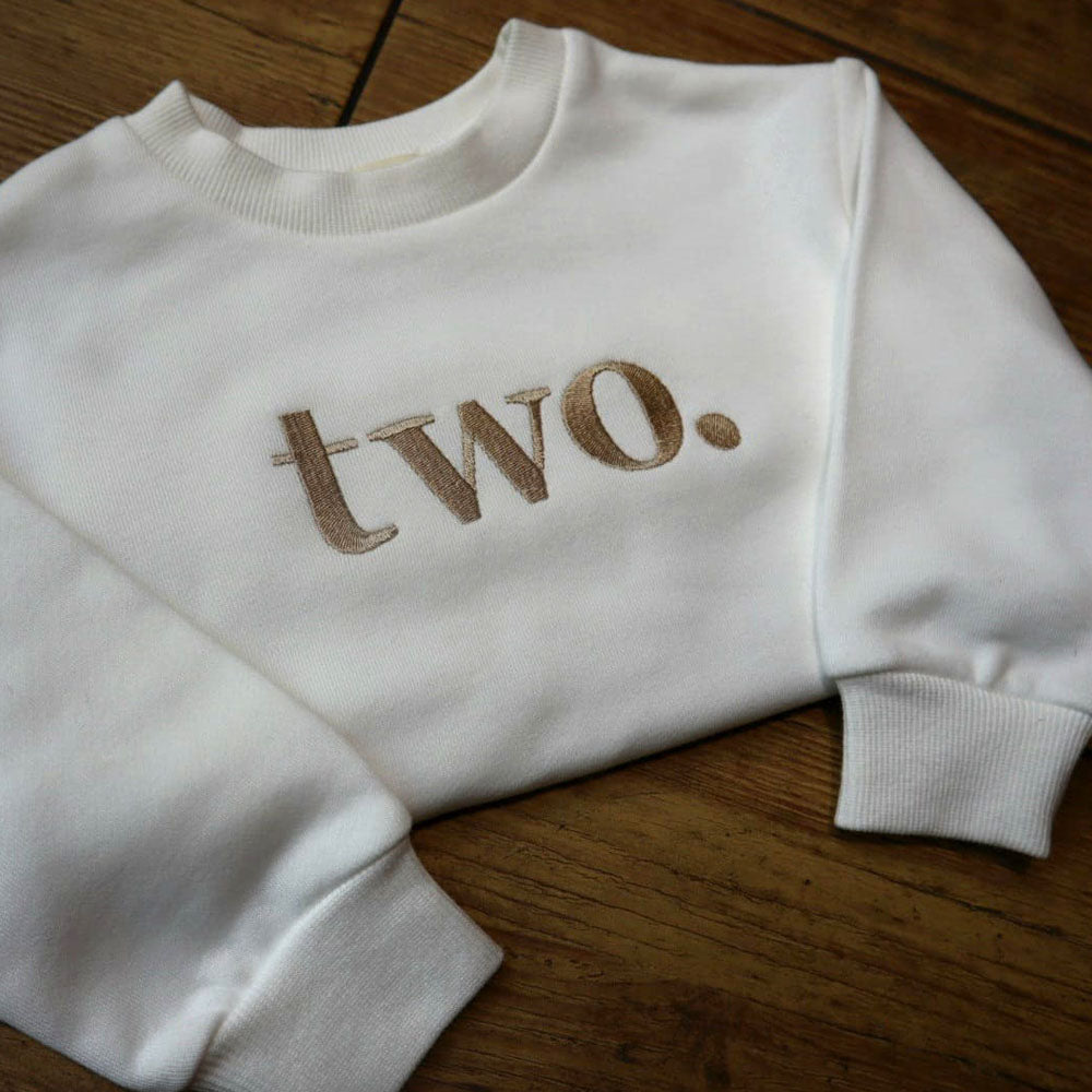 Celebrate your little one's special milestone with our elegant white sweatshirt, made from premium organic cotton. This piece is thoughtfully embroidered with the birthday age - "one", "two", or "three" - in a refined champagne thread for a touch of class. Tailor the thread colour to your preference, and remember the chic full stop after the number is optional and can be left out upon request. Ideal for making your child's birthday standout, this contemporary sweatshirt is as distinctive as the day itself!